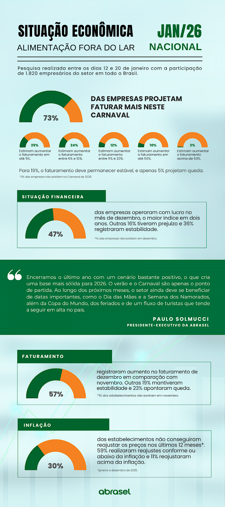 A poucos dias do Carnaval, bares e restaurantes se preparam para um período tradicionalmente marcado por mais movimento e consumo. Uma pesquisa da Abrasel mostrou que, entre os empresários que pretendem abrir durante a folia (72%), a maioria (73%) espera aumentar o faturamento em comparação com o mesmo período do ano passado.